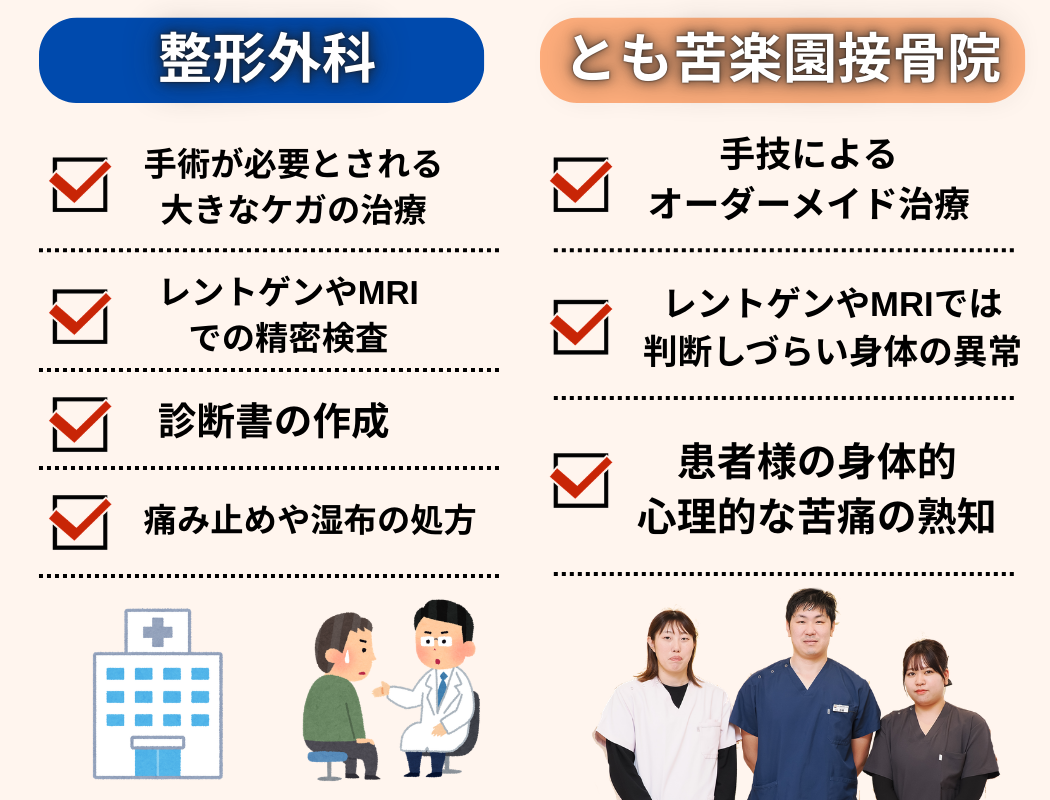 とも苦楽園接骨院では事故後の症例を過去に多く経験した施術者が担当します。