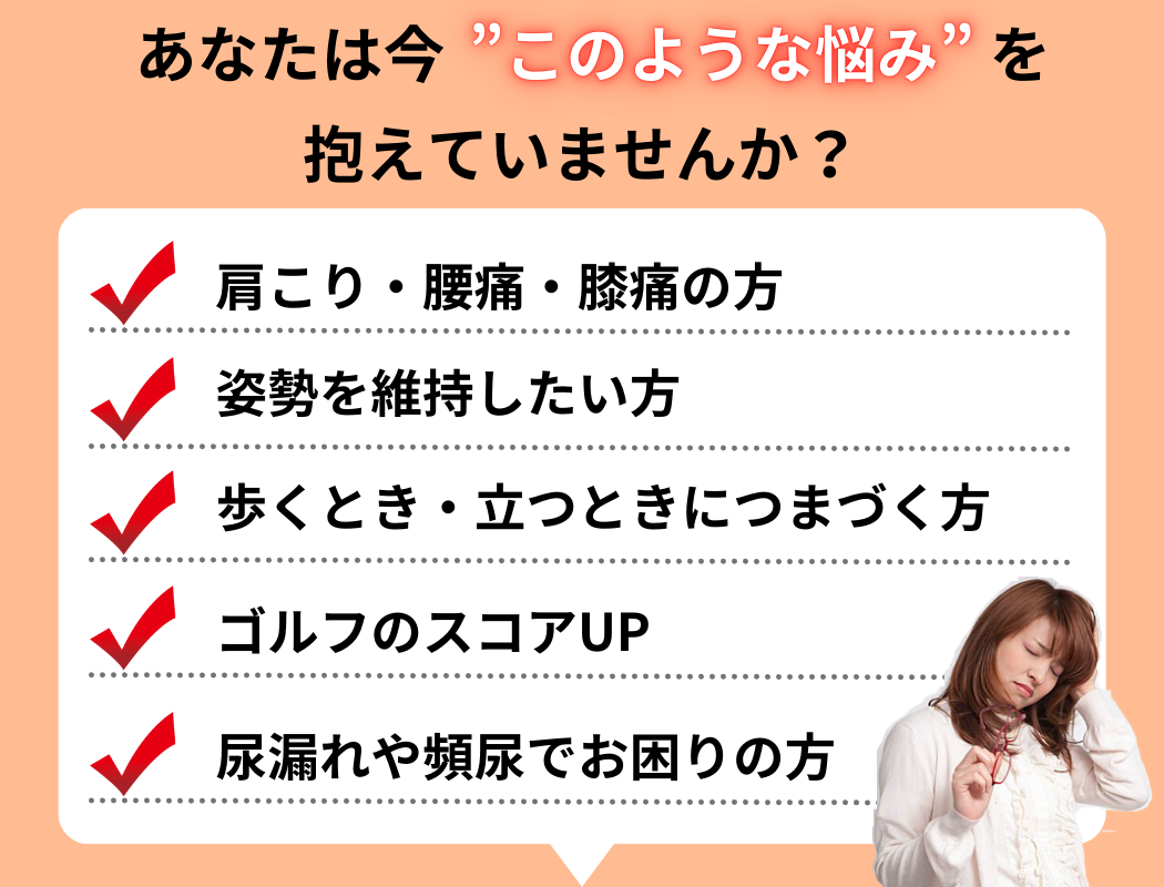 筋肉や骨格とともに、深部で骨盤を支えているインナーマッスルを強化することにより、表層の大きな筋肉のみを施術した場合と比較してゆがみを戻りにくくしていきます。