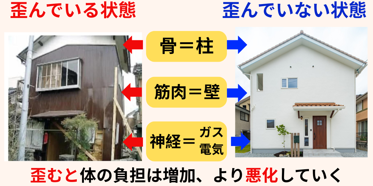 例えるなら、お家で言う柱(土台)は骨盤であり、神経系は電気・ガスなどのインフラで、筋肉は壁になります。