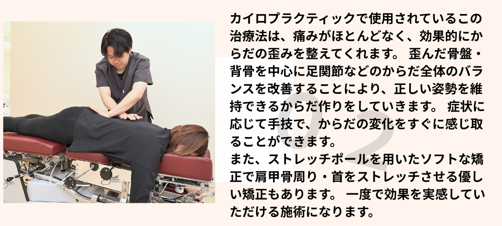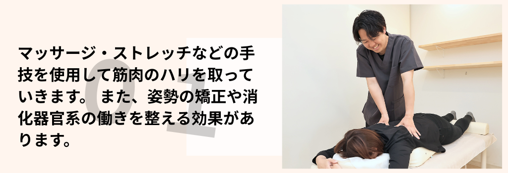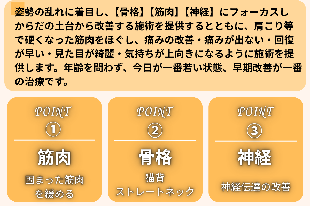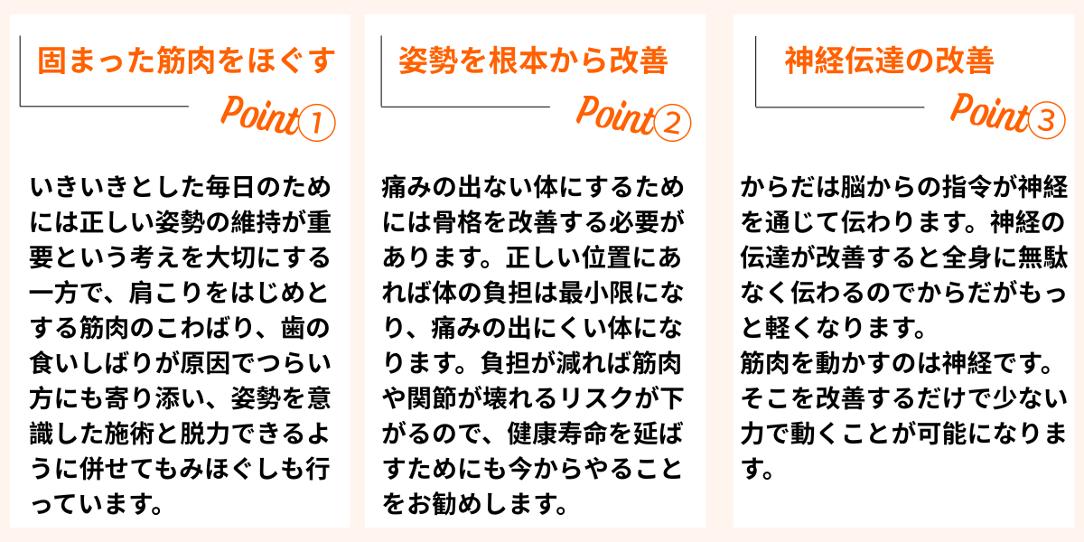 患者様目線にたち、効果を実感いただきやすい施術を中心に、筋肉や骨格、神経に優しくアプローチして行きます。気持ちのいい施術ですので、リラックスして受けていただけます。もし強めの刺激をご希望の方には強めで施術いたします。