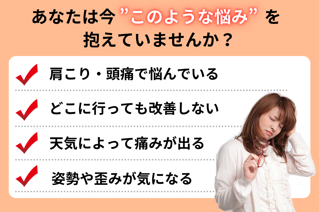 また、歪みが原因で肩こりを悪化させ、頭痛が伴うことも少なくありません。